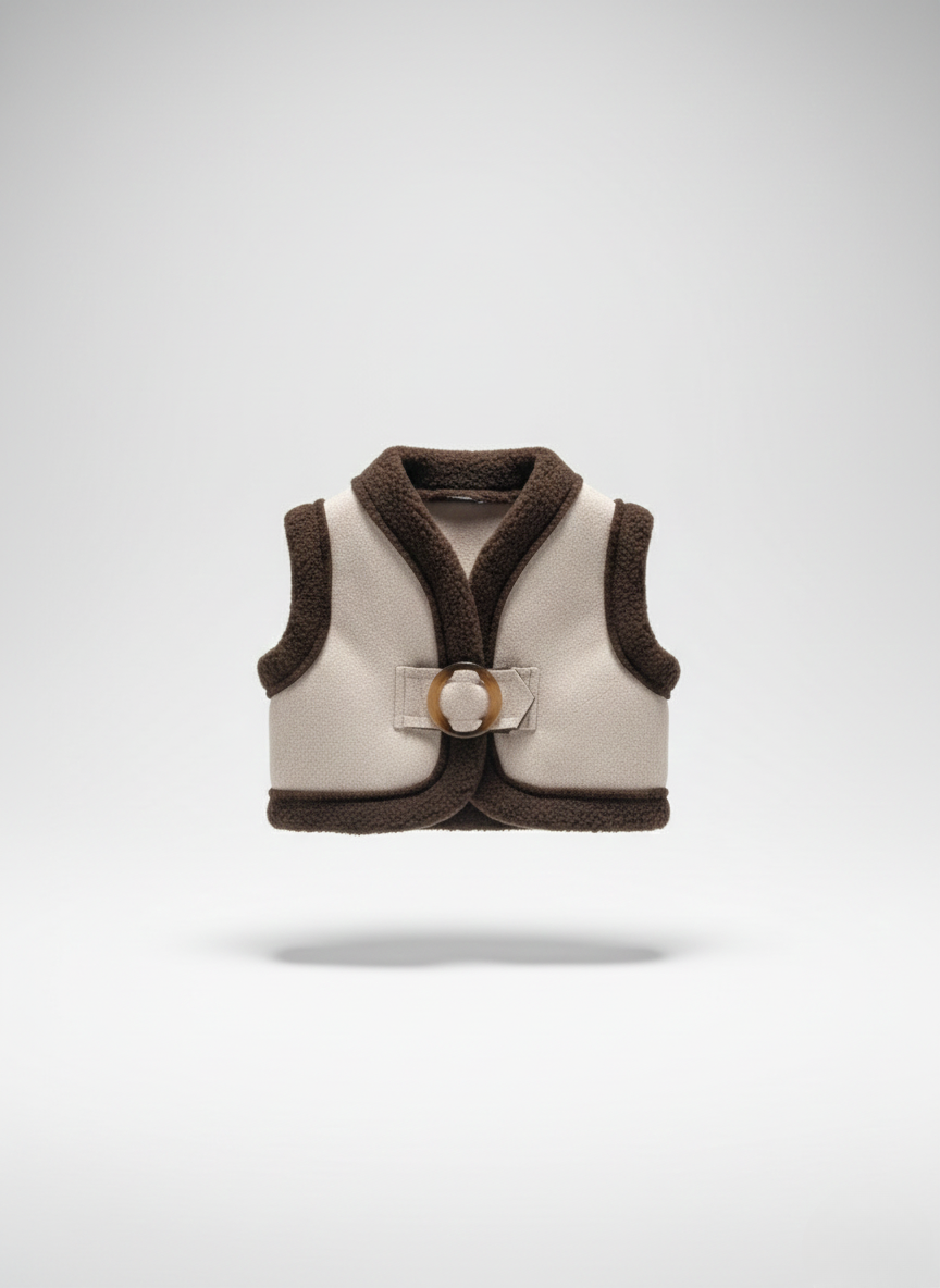 A high-pile Sherpa fleece (faux shearling) vest in a light beige/oatmeal color. It features a contrast dark brown trim, two functional front patch pockets, and a traditional toggle button closure.